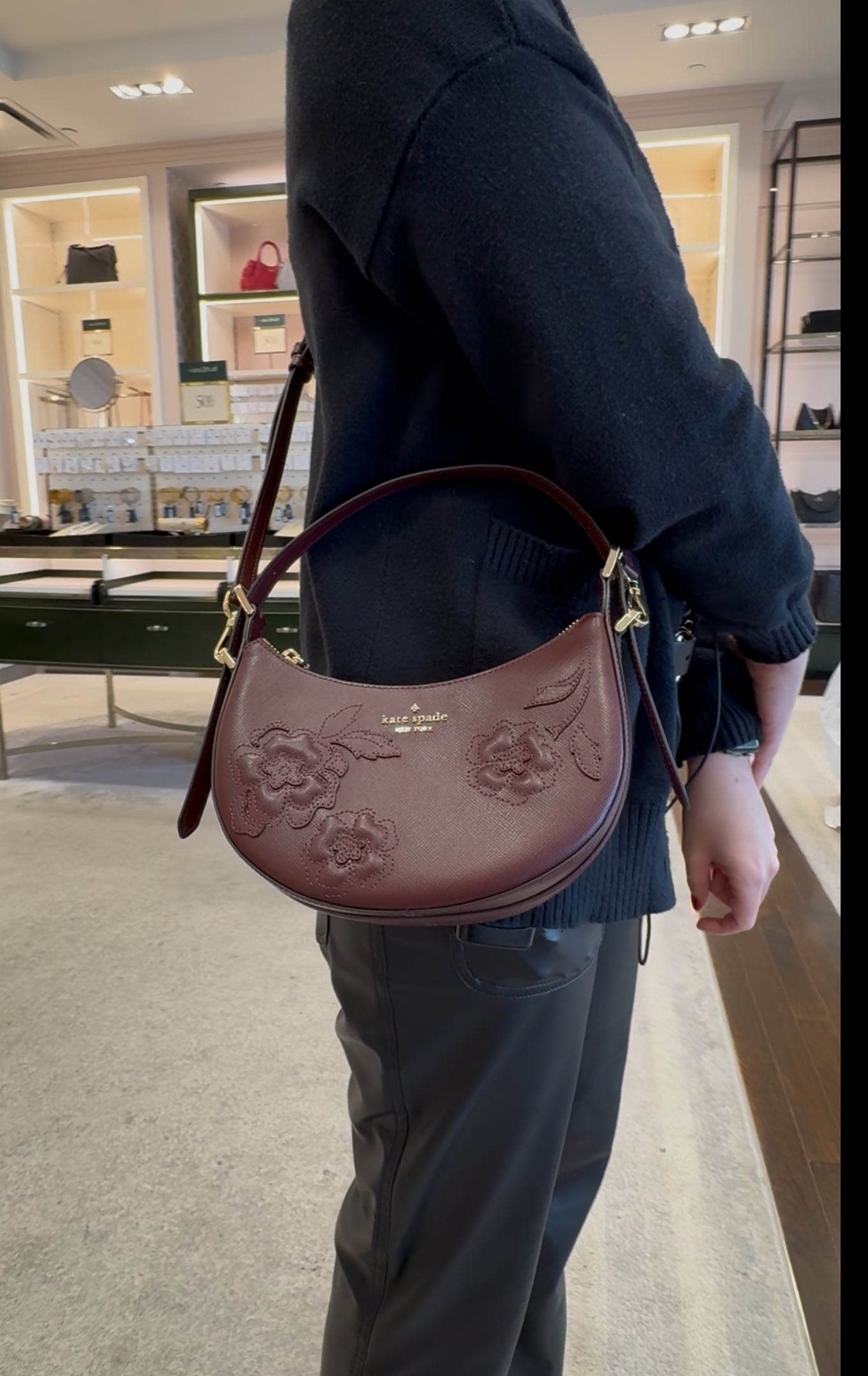 Kate Spade Nova Floral Applique Crescent Shoulder Bag Dark Merlot